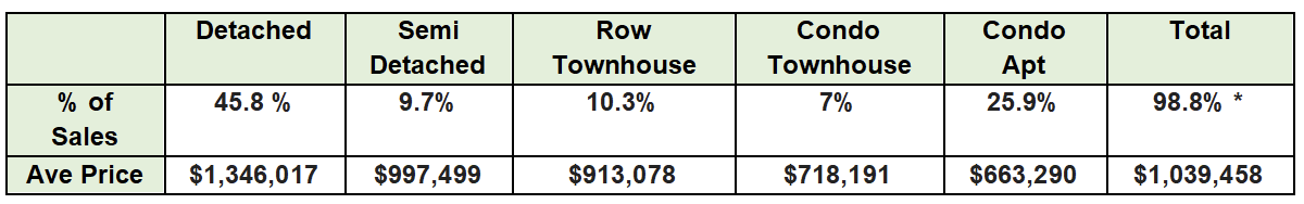 *The missing 1.2% is made of 4 other categories, Link homes, Co-Op apartments, Detached Condos and Co- Ownership apts. They represent such a small % of the sales with negligible impact on the average price so I have not included them, to make the chart easier to read.